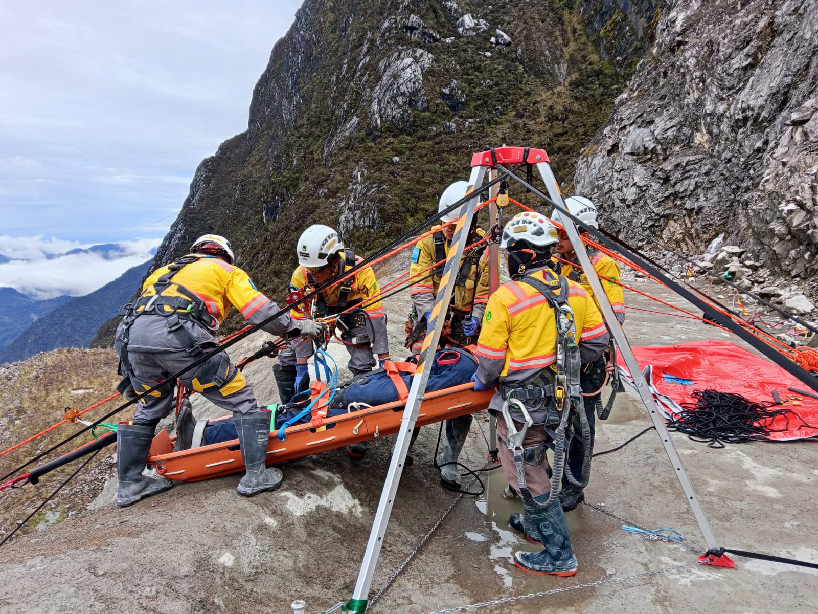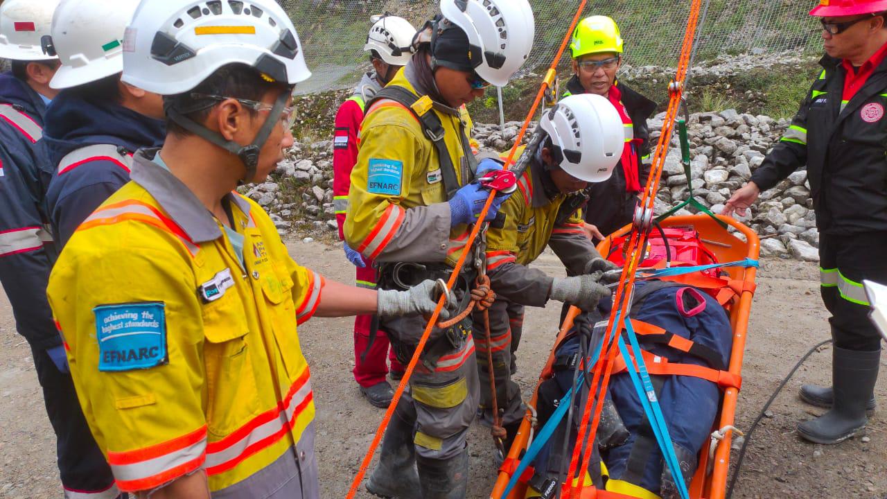 Tim kami tentu dipimpin oleh personel bersertifikat TKPK Level 3 dan Level 2 Kemenaker RI serta didukung oleh first aider yang kompeten. Tidak berhenti di situ, kami juga menggelar Full Scale Drill Simulation di area Grasberg, memastikan metode Tyrolean benar-benar efektif sebelum diimplementasikan dalam kontestasi.